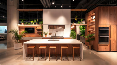 This refined and on-trend kitchen display showcases an eco-friendly design featuring eco-conscious wood slab cabinetry, smart built-in appliances, a flawless radiant white countertop, and