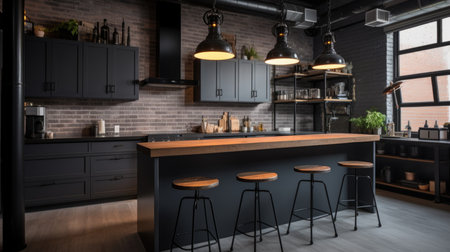 Interior design of Kitchen in Industrial style with Cabinets decorated with Concrete, Steel, Wood material. Industrial architecture. Generative AI AIG24.