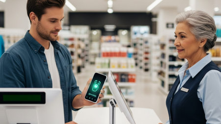A male customer in a suit holds a smartphone and credit card near a payment terminal in a clothing store while digital icons representing secure banking and commerce float in the air above the counter.