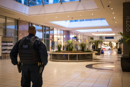 Dedicated guard stationed at the entrance of a busy mall scanning the area with focus to prevent unauthorized access and enhance public safety.