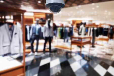 A close-up of a dome-shaped CCTV camera installed in a retail store, with reflections of products visible on the camera lens, emphasizing security in shopping environments.