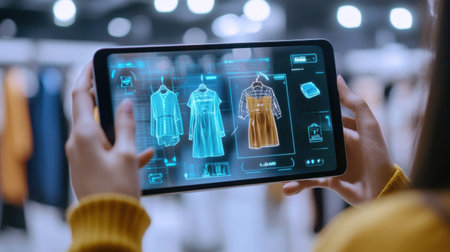 Inside a brightly lit store, a person holds a tablet displaying dresses with augmented reality.