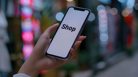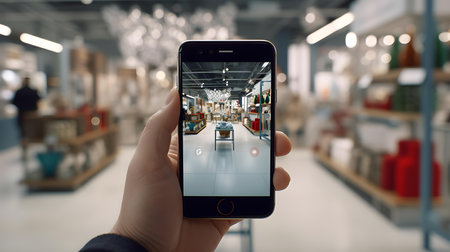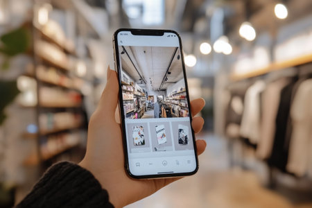 Person interacts with a smartphone app to explore an online store while enjoying a contemporary shopping atmosphere filled with stylish displays