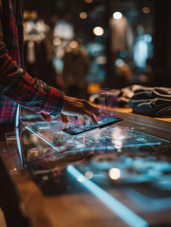 Individual is using a touchscreen in a stylish shop, looking at product details while warm ambient lighting creates a welcoming atmosphere around them.