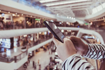 Hand holding mobile phone with shopping mall blurred background and bokeh light, Internet, Social medai