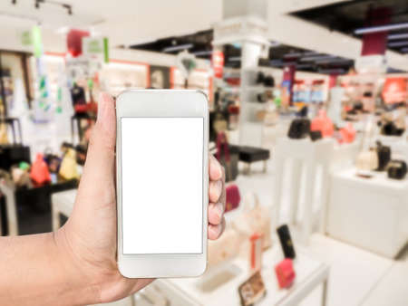 Smart phone with white screen in hand on blurred in shopping mall background,shopping online concept,shopping by smart phone