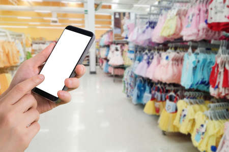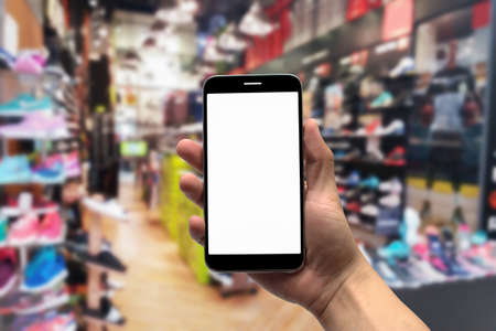 Hand holding smartphone in clothing store. Mock up mobile phone image of hand holding smart phone with blank white screen for your advertisement on blurred background of clothing shop.