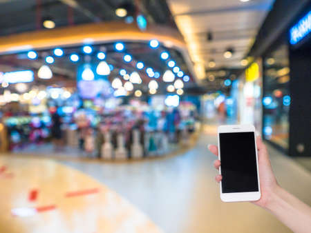Hand holding mobile phone with Shopping mall or department store blurred background and bokeh light, Social network, internet