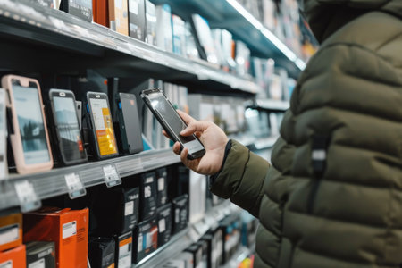 Person comparing prices of items on a shelf in an electronics store