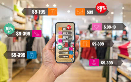 Augmented reality marketing in the shopping mall. Hand holding smart phone use AR application to check information