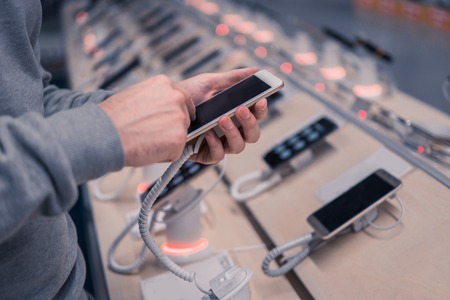 Smartphone with a white screen on the background of a technology store