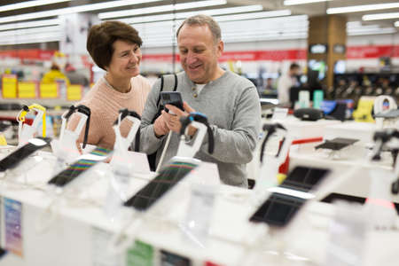 Middle aged wife and husband picking new smartphone in electronic store