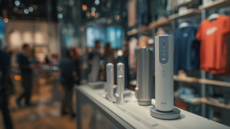 Medium shot of a sleek wellness tech display featuring sleep tracking devices with the product crisp and clear against a blurred retail environment.