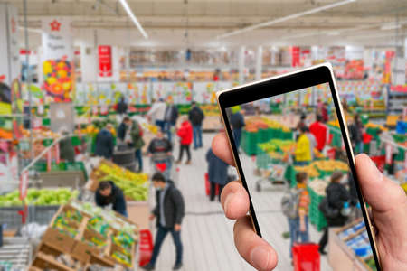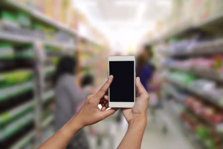 Blurred supermarketon the smartphone screen .. Selling goods in a retail store. Blurred background of shoppers in a store.