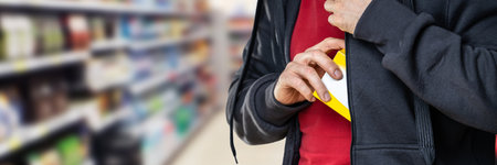 A thief in a mask and hoodie covertly steals snacks in a supermarket.