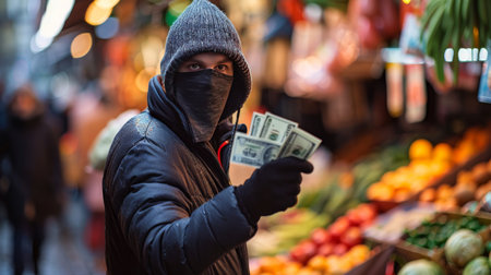 In a dimly lit store aisle, a thief in a mask and hoodie covertly steals snacks, instilling fear and prompting criminal activities in the shadows