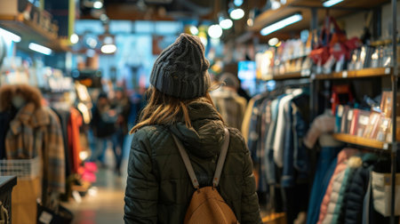 A young man wearing a backpack and jacket stands in a modern store, surrounded by shelves filled with various items. The image captures a moment of contemplation and urban lifestyle.