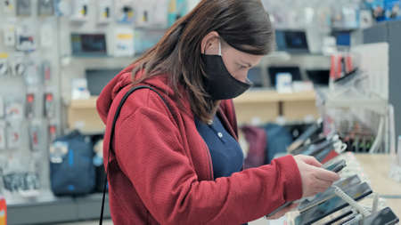 Young woman wearing a protective medical mask against the virus buys a smartphone in a gadget and electronics shop