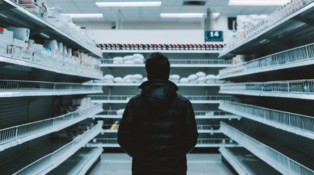 Man holding empty shopping basket in deserted grocery store aisle. Food shortage and supply chain crisis concept. Economic downturn.