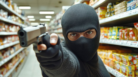 A masked robber in a store aisle, creating a tense and dangerous situation, emphasizing crime and theft. High quality photo