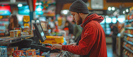 A dedicated cashier attentively operating a register in a bustling grocery store, exemplifying professionalism and customer service in a retail environment.