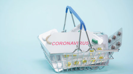 Medicine concept. Various packs of tablets and medicine in shop trolley with some copy space. Buy and shopping medicine. Creative idea for health care, health insurance and pharmaceutical company.