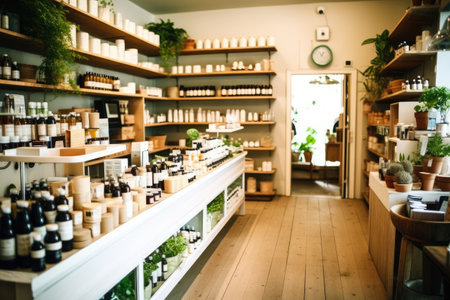 Health store shelves with natural supplements, warm glow, organic wellness products.