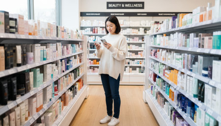 Young asian woman stands in a bright beauty aisle, comparing a product label with smartphone info to make an informed skincare purchase while browsing shelves and prices