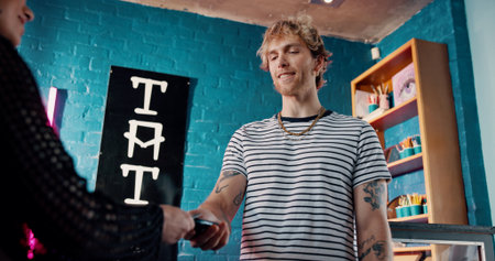 People, credit card and POS for payment at shop, tattoo parlor and banking for finance debit. Small business owner, customer and fintech machine with male person, smile and transaction at studio