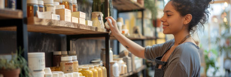 a Hispanic small business owner organizing products on shelves in a cozy boutique