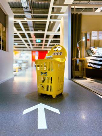 Munich, Germany - Apr 12, 2024: An IKEA shopping cart is left on the vinyl floor with an illuminated arrow inside the Swedish furniture store, emphasizing the stores navigational design and modern shopping experience