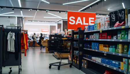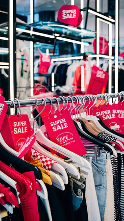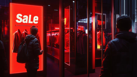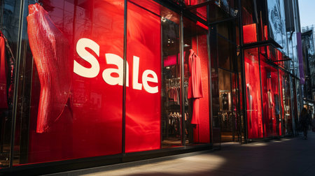A lively shopping district features a storefront adorned with striking red sale banners, enticing passersby to explore stylish clothing. The vibrant exterior reflects the city's energy and fashion.