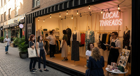 Customers browse through clothing at a trendy boutique shop housed within a converted shipping container on a cobblestone street. A neon sign reads 'Local Threads,' creating an inviting and modern urban retail atmosphere.