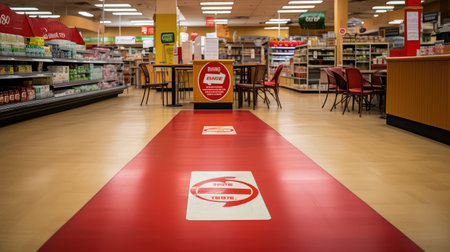 Stow on the Wold, UK - July 06, 2020: One way system and social distancing signs in Tesco, the third-largest retailer in the world, with over 3400 shops in UK.