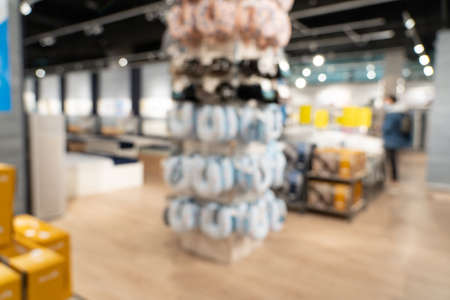 Abstract blurred of fashion clothes shop boutique interior in a shopping mall, with bokeh light background.