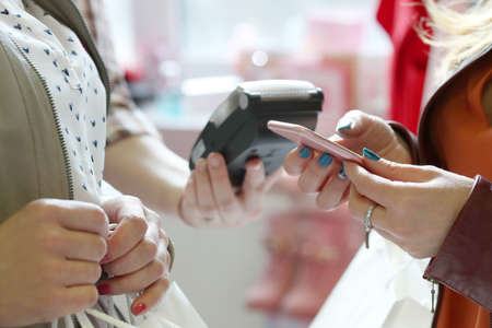 Urban shopping payment. Female lifestyle. Woman purchasing with credit card.