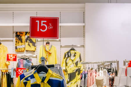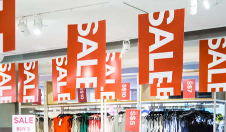 A sign with the inscription SALE in white on a red background in the trading floor of casual clothing store. Fashion concept, discount season, black friday, offline shopping, web banner