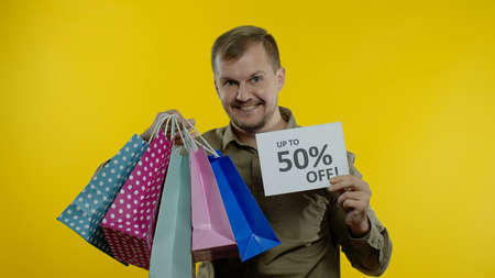 Happy man showing shopping bags and Up To 50 percent Off inscription note, smiling, celebrating, rejoicing good discounts, low prices for online sales. Yellow background. 6k downscaled, slow motion