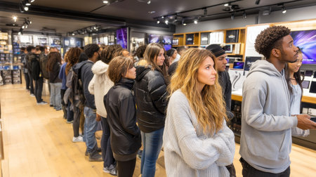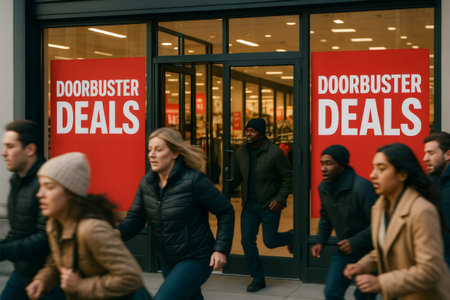 Shoppers rushing into stores, eager for doorbuster deals during a chaotic shopping frenzy filled with excitement and urgency