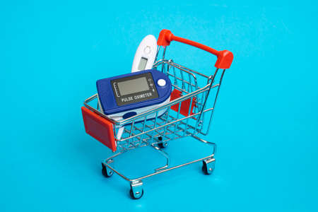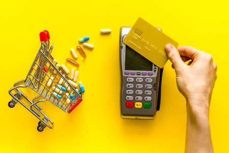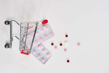 Top view on a close-up of a bunch of different medicines and miniature shopping trolleys. Cart and basket full of pills on the table. Pharmacy concept. No one