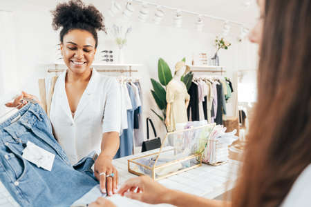 Fast and friendly point of sale. Two sales clerks helping a customer purchase a pair of jeans in a clothing store.