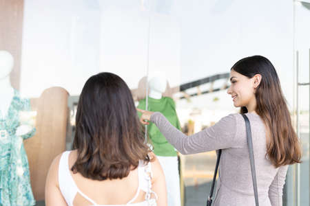 Young beautiful brunette woman with a short haircut in a white sweater chooses stylish clothes in a store in a shopping mall