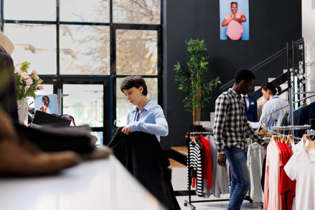 Manager preparing store for opening, arranging stylish clothes for customers in modern boutique. Shopping centre employee checking fashionable merchandise, working with trendy items