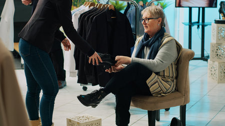 Retail worker presenting various pairs of shoes for senior client, assisting woman to find the perfect footwear in fashion showroom. Elderly customer trying on footgear before buying. Camera A.
