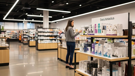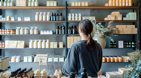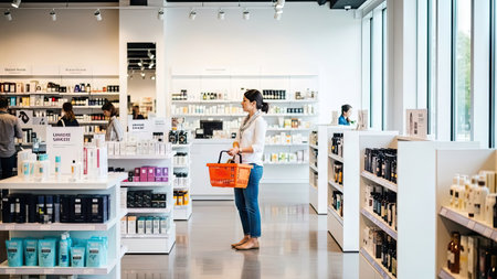 A woman examines beauty products displayed on shelves inside a well-lit retail store. The composition features a neutral color palette with various cosmetic items. The overall style suggests a modern and organized environment. This image could be used for advertising, editorial content, or marketing materials.