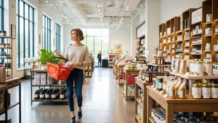 A woman is seen shopping inside a store, carrying a basket and browsing shelves. The scene features a bright, airy interior with natural daylight, showcasing various products. This image could be used for advertising, editorial content, or design projects related to retail or consumerism.