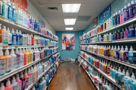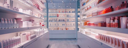 A sleek, modern cosmetic store featuring rows of neatly arranged skincare products on illuminated shelves, creating an inviting and professional retail environment.