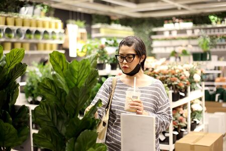 New normal during covid epidemic. Caucasian woman shopping at retail furniture and home accessories store wearing protective medical face mask to prevent spreading of virus.