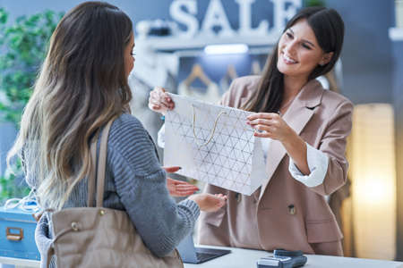 Woman taking shopping bag from the seller, she doing shopping during sale in the store