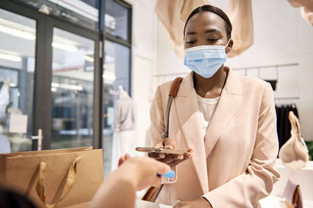 Responsible woman wearing a mask while working at the shop and giving a red bag to her elderly customer